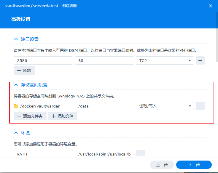 然后存储空间设置,添加文件夹,路径为刚刚创建的 docker/bitwarden , 容器路径一定要挂载 /data ;