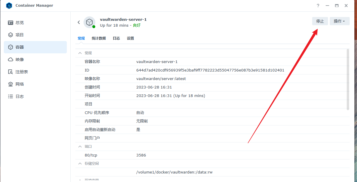 注册完成后如果不想其他用户进行注册的需要关闭注册功能。在群晖中停止一下容器,选择设置–环境,