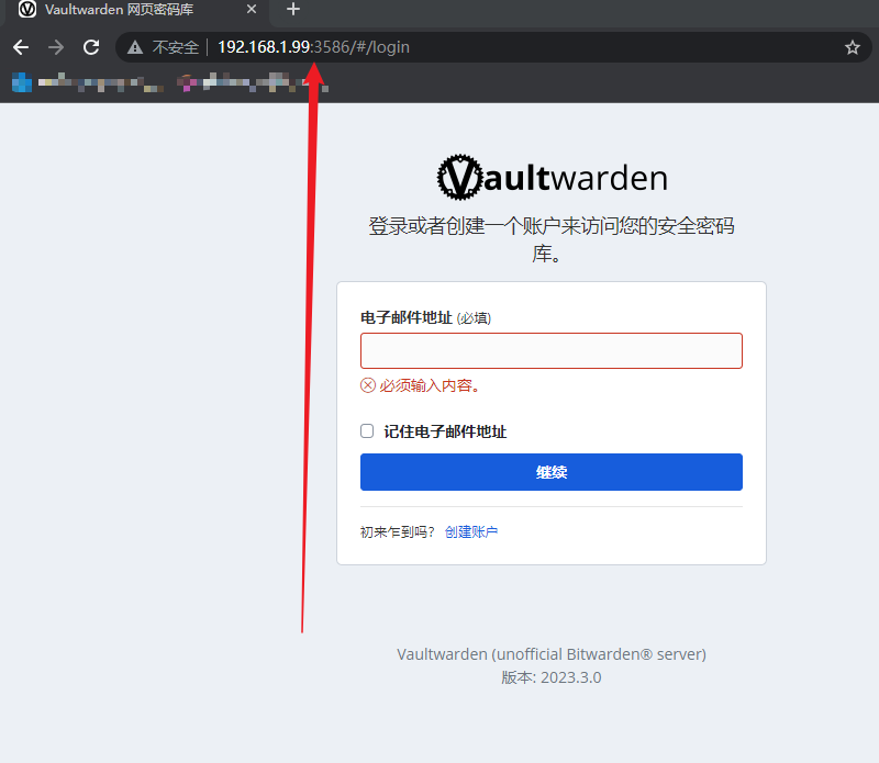 配置完毕以后把bitwarden容器运行起来,这个时候使用 [群晖ip:3586] 即可访问到bitwarden的登录页面了,