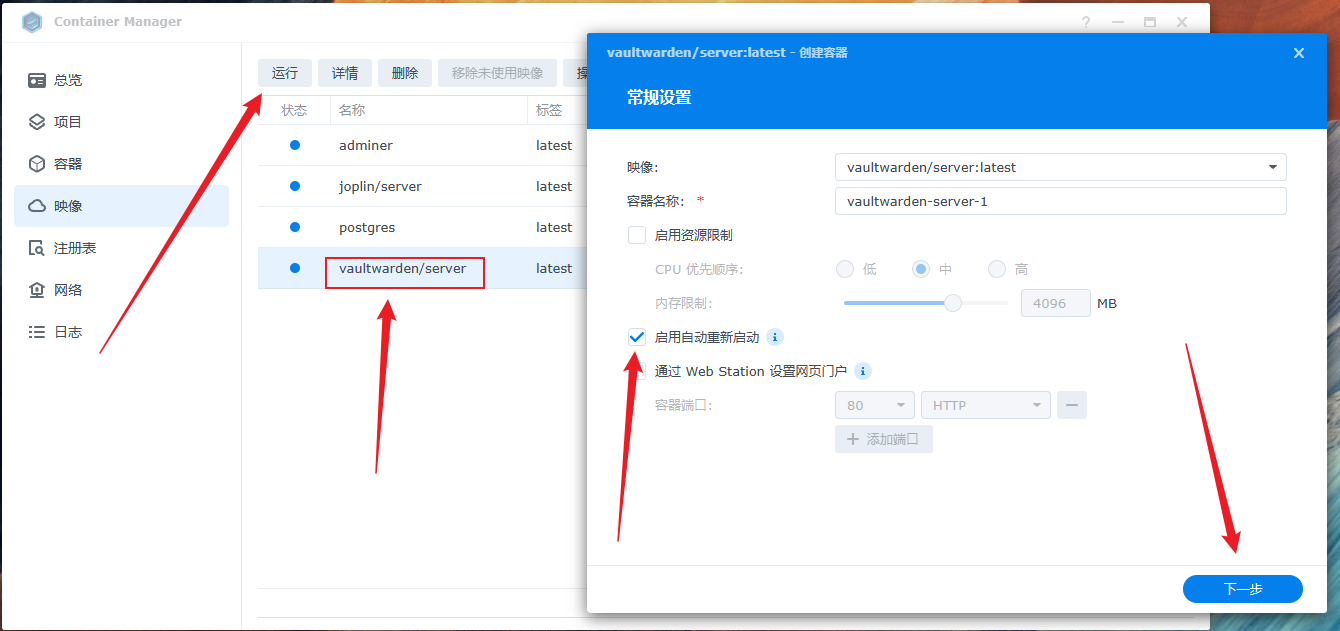 下载好以后选中映像,在映像中找到 vaultwarden/server ,双击进入配置,修改容器名称(随意修改,我一般用默认值),自动启动,开不开看你自己需求,然后下一步;